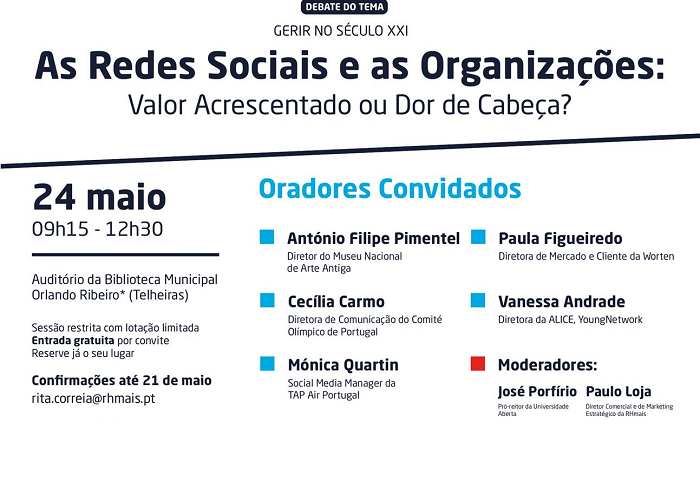 No dia 24 de Maio, a Engage Consulting esteve presente na V edição dos «Momentos Singulares», dedicada à dicotomia associada às redes sociais enquanto ferramentas de comunicação das organizações. Neste debate, organizado pela RHmais em parceria com a Universidade Aberta, no Auditório da Biblioteca Municipal Orlando Ribeiro em Lisboa, estiveram oradores de diversas áreas de atividade profissional, cujo denominador comum é a gestão da comunicação através de plataformas digitais.
